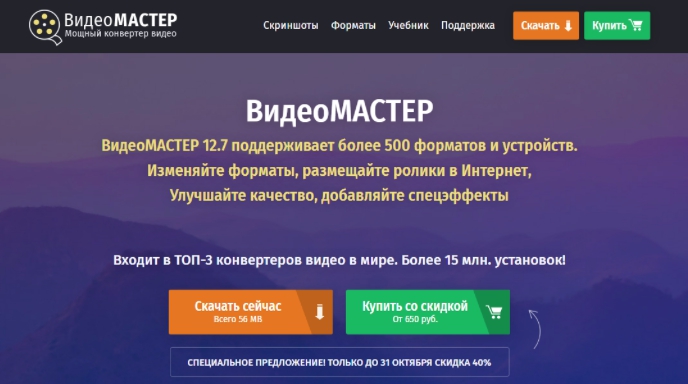 ВидеоМАСТЕР 12.7 поддерживает более 500 форматов и устройств. Это быстрый универсальный конвертер, включающий все необходимые функции для работы с видео. Он позволяет скачивать, изменять форматы, улучшать качество видео. Для скачивания нужно пройти по ссылке https://video-converter.ru/.