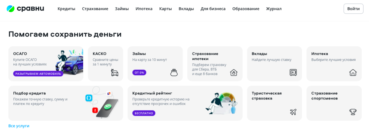 На сайтах маркетплейсов и онлайн-витринах можно выбрать наиболее выгодный вклад или кредит, посмотреть, какие МФО выдают беспроцентные микрозаймы, или купить наиболее дешёвый полис ОСАГО. Это удобно, потому что не нужно заходить на сайты десятка компаний, чтобы сравнить, где дешевле страхование или где ниже ставки по ипотеке.