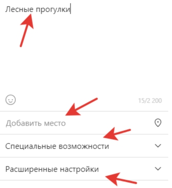 - Нажав далее мы сможем указать свое месторасположение, добавить подпись, выбрать расширенные настройки (например, чтобы выключить комментарии) или включить специальные возможности (например, чтобы включить субтитры).