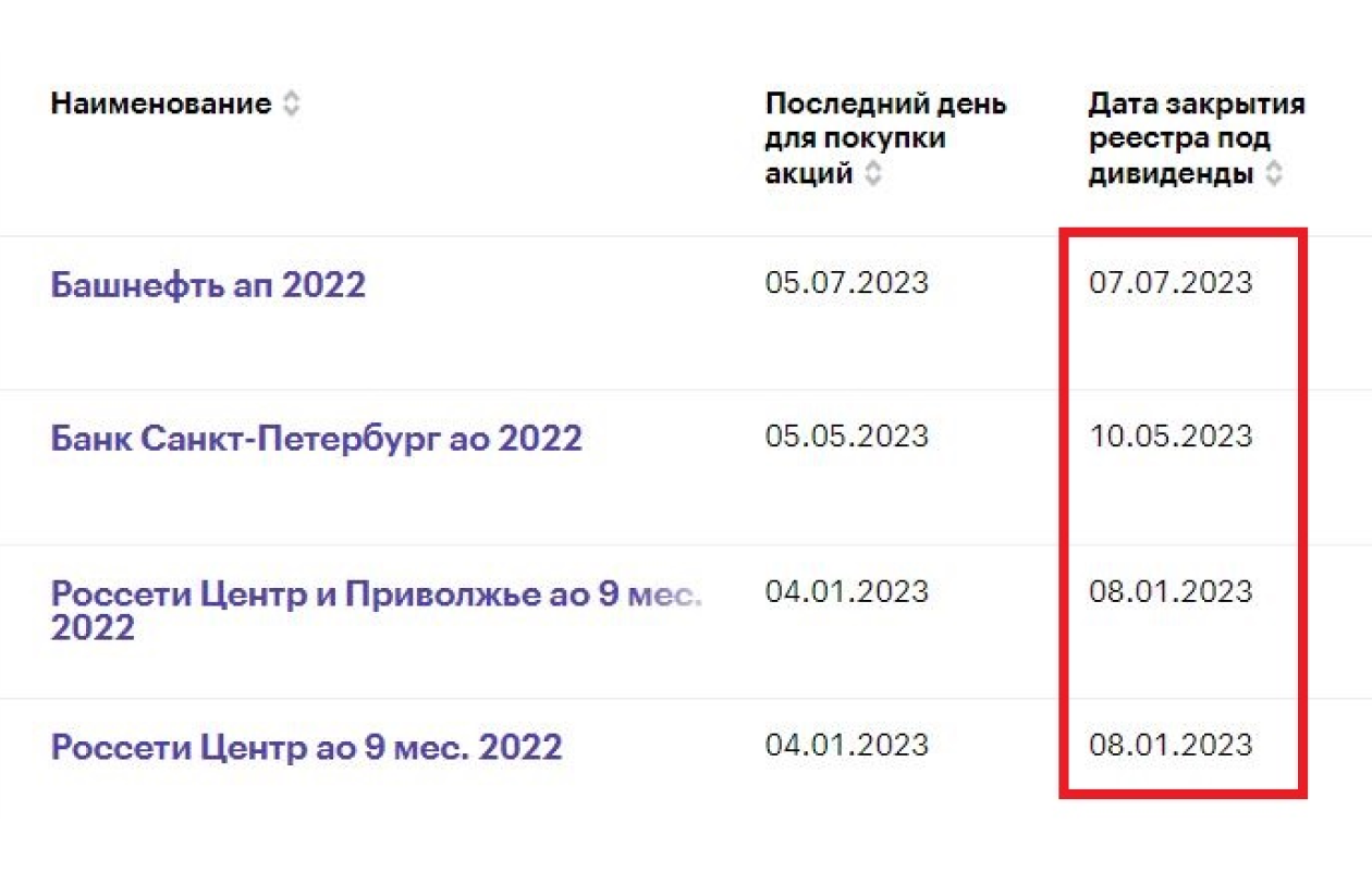 Выгоднее всего покупать акции на следующий день после дивидендной отсечки, когда стоимость бумаги снижается примерно на размер дивиденда. Узнать день дивидендной отсечки (также называют «днём закрытия реестра акционеров») можно из дивидендного календаря. Например, если реестр закрывался 7 июля 2023 года, то бумагу можно было выгодно купить на следующий торговый день — 10 июля.