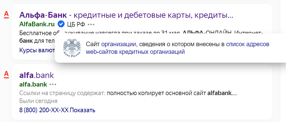 Сайт банка в поиске «Яндекса». С синей галочкой — официальная версия, которая точно не будет мошеннической.